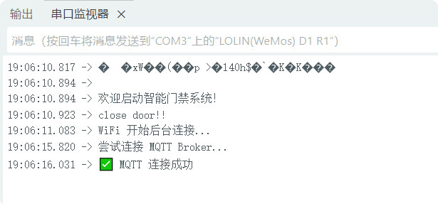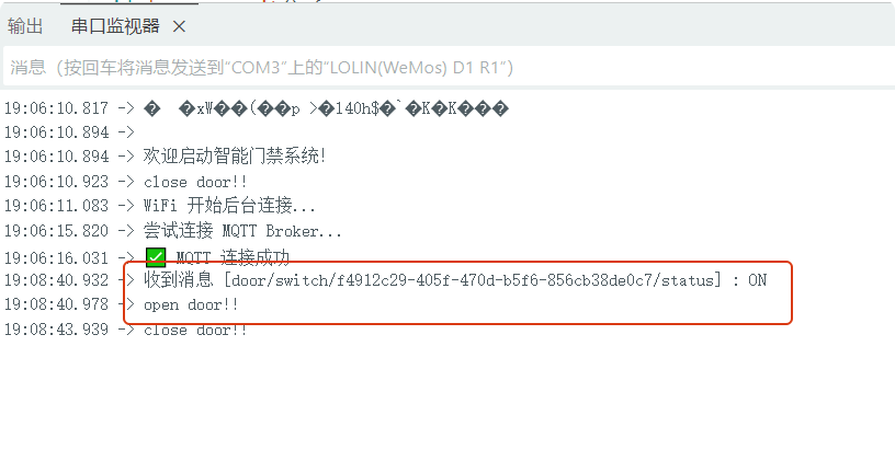 点击微信小程序解锁按键,串口监视器中见到以下信息,则表示mqtt远程控制成功。